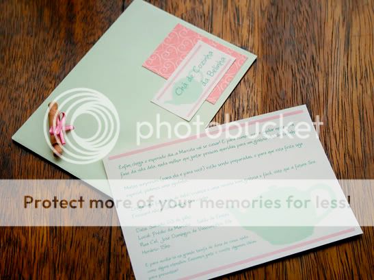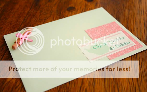 O convite foi feito com acabamento artesanal em scrap, e o logo também foi utilizado nas tags colocadas nas lembrancinhas.